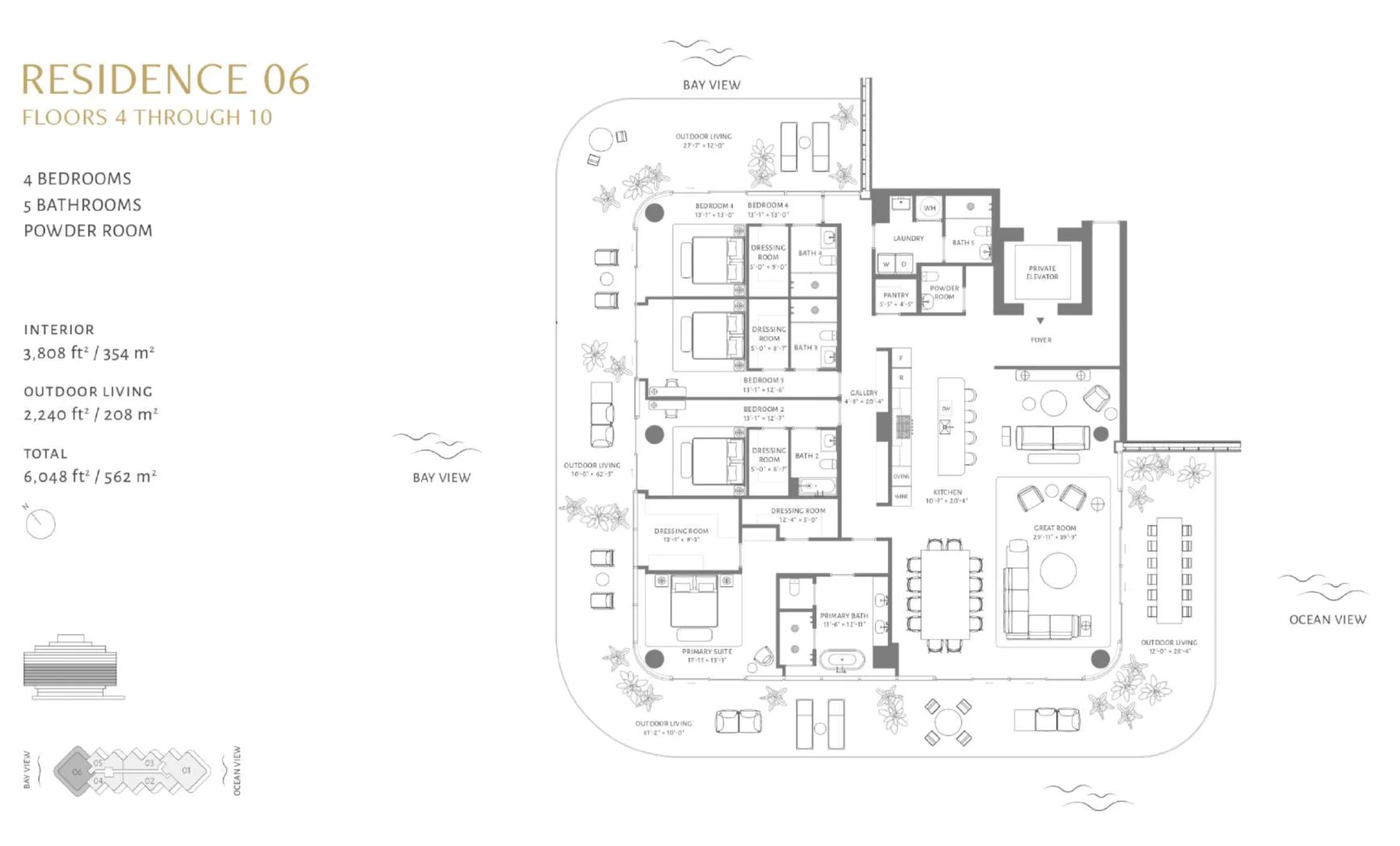 Within its glass towers are 73 meticulously designed residential units, featuring two to four bedrooms, open and integrated floor plans, and expansive terraces with stunning views. Elegantly decorated living areas flow into fully equipped professional kitchens, maximizing every square meter for enhanced functionality. Residences range from 2,100 to 6,700 square feet (approximately 195 to 622 square meters).